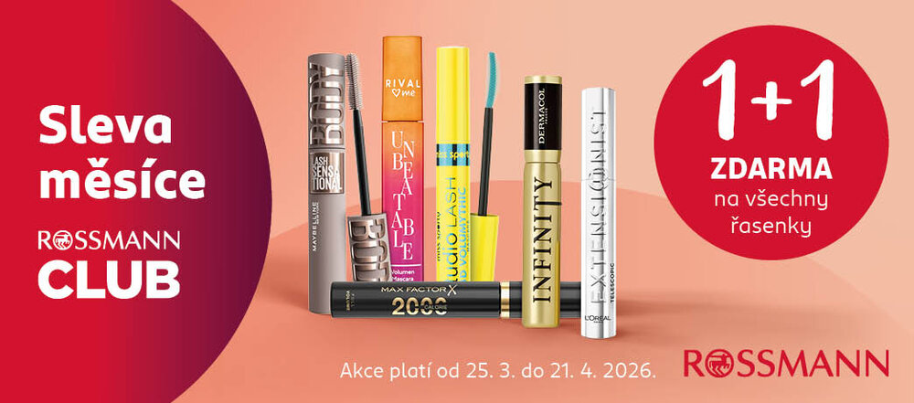 Objevte Slevu měsíce v ROSSMANN CLUBU! 💄 Využijte akci 1+1 zdarma na všechny řasenky a dopřejte svým očím perfektní look za skvělou cenu. Platí od 25. 3. do 21. 4. 2026.
