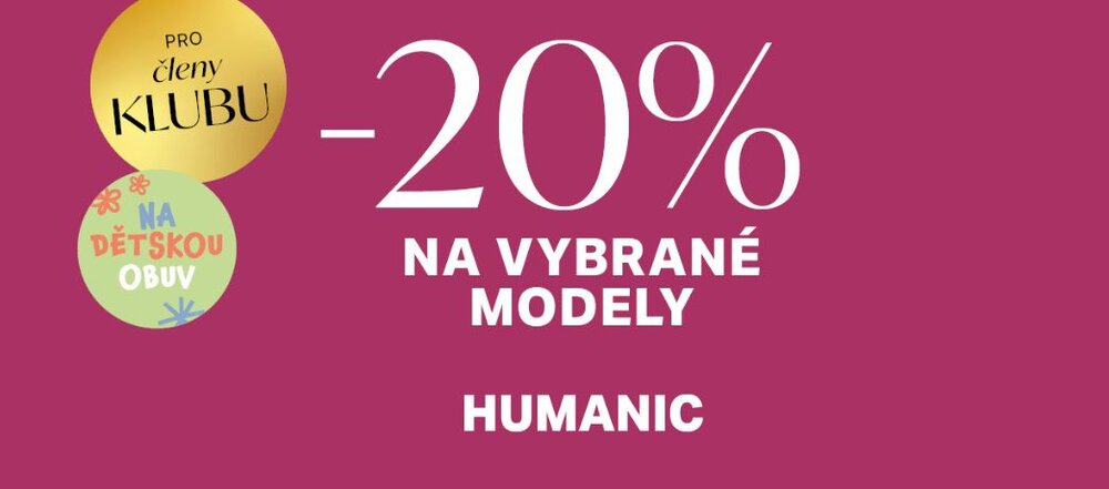 Exkluzivně pro členy zákaznického klubu HUMANIC: vybrané top modely dětské obuvi teď nakoupíte se slevou 20 %. Vyberte dětem nové tenisky na jaro, ať mají v čem dovádět! Podmínky akce najdete v prodejně.