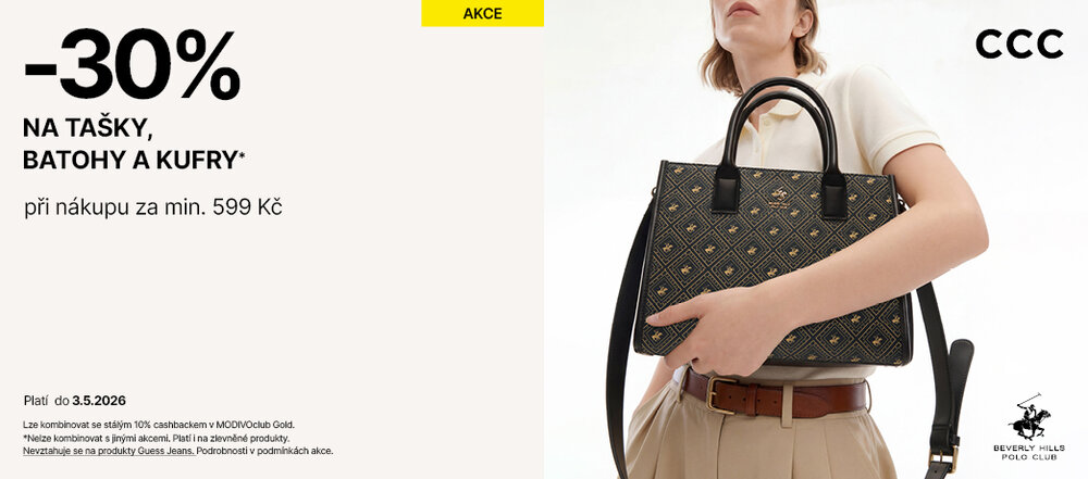 Vyberte si svůj nový kousek na cesty i do města se slevou 30 % při nákupu za min. 599 Kč. Stylové tašky, praktické batohy i prostorné kufry teď pořídíte ještě výhodněji. Akce platí i na zlevněné produkty do 3. 5. 2026 v prodejnách CCC, v aplikaci a na https://ccc.eu/cz/!
