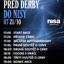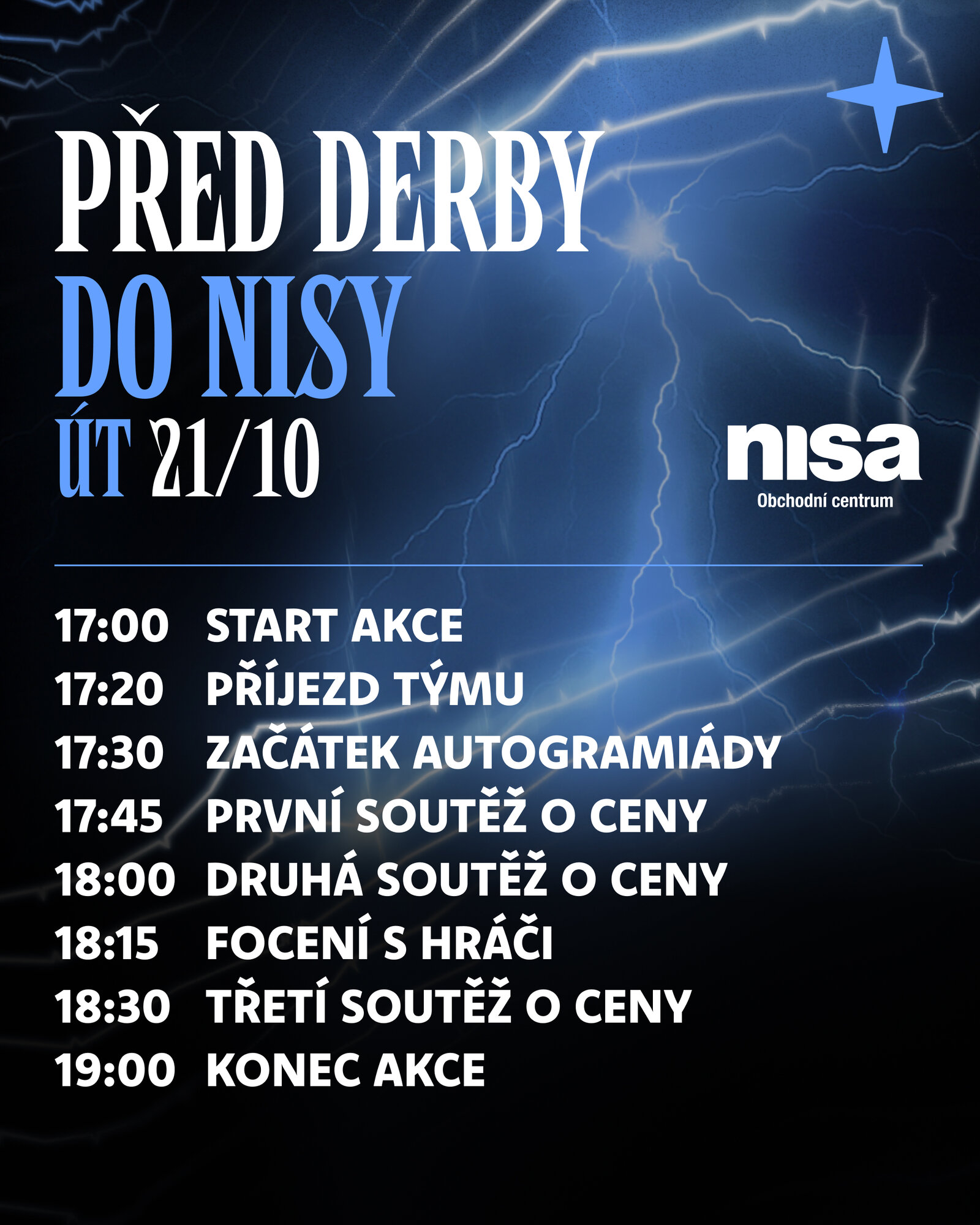 Zveme vás na velkou akci, která proběhne v OC Nisa Liberec v úterý 21. října. Přijďte se naladit na 65. Podještědské derby proti Jablonci a povzbudit tým před tímto důležitým zápasem. Akce se uskuteční ve druhém patře Obchodního centra NISA, v horní pasáži před jídelní zónou. Vstup je zdarma!