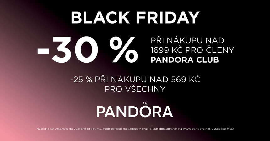 Black Friday – sleva 30 % pro klubové zákazníky při nákupu nad 1699 Kč a sleva 25 % při nákupu nad 569Kč pro všechny. Akce platí na vybrané produkty. Podmínky akce jsou dostupné na pandora.net anebo na prodejnách.