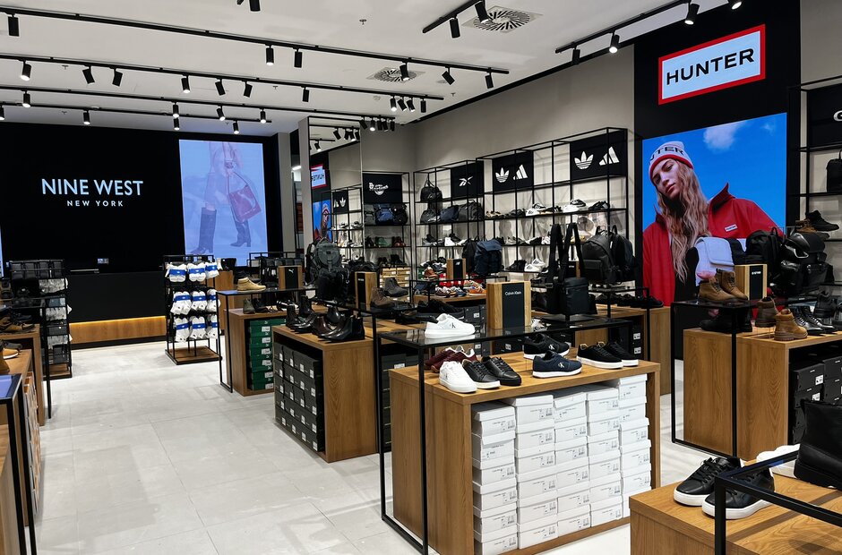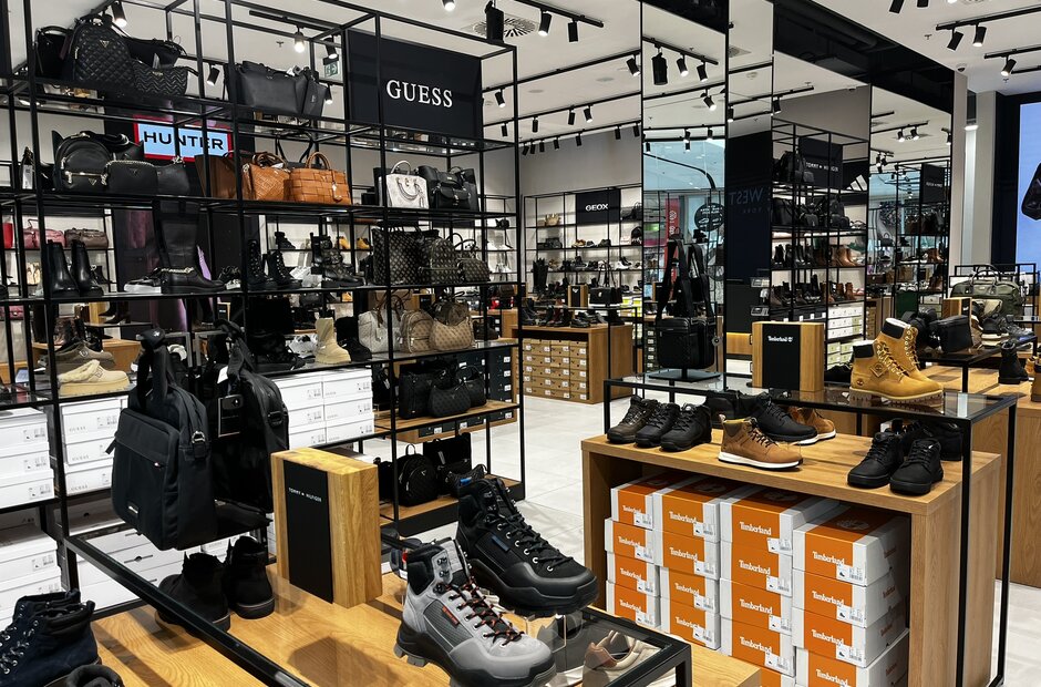 Moderní interiér obchodu, prostorné uličky a promyšlené uspořádání vybízejí k pohodlnému a příjemnému nakupování. Zákazníci si mohou prohlížet tisíce produktů – od prémiových kolekcí po sportovní nabídky.
