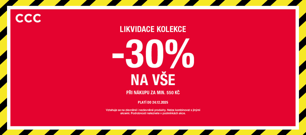 Sleva 30 % na vše při nákupu za min. 550 Kč. Obuv, kabelky a doplňky světových značek nyní ještě levnější! Akce platí i na zlevněné produkty do 24. prosince v prodejnách CCC!