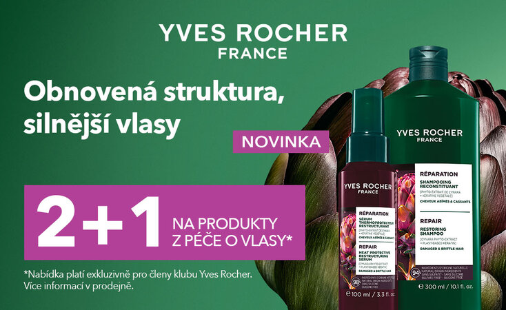 Přijďte do prodejny rostlinné kosmetiky Yves Rocher a objevte novou řadu produktů pro regeneraci vlasů. Členové věrnostního klubu Yves Rocher mohou navíc až do 5. 5. 2026 využít jedinečnou nabídku 2+1 zdarma na všechny produkty vlasové péče! Více informací v prodejně Yves Rocher a na www.yves-rocher.cz.