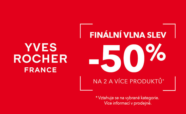Nechte se zlákat finální vlnou zimních slev v prodejně rostlinné kosmetiky Yves Rocher a přijďte nakoupit své oblíbené produkty se slevou 50 %. Nabídka platí do 28. 1. 2026. Sleva se vypočítává z katalogových cen a nevztahuje se na dárkové balíčky a šeky. Více informací v prodejně Yves Rocher a na www.yves-rocher.cz.