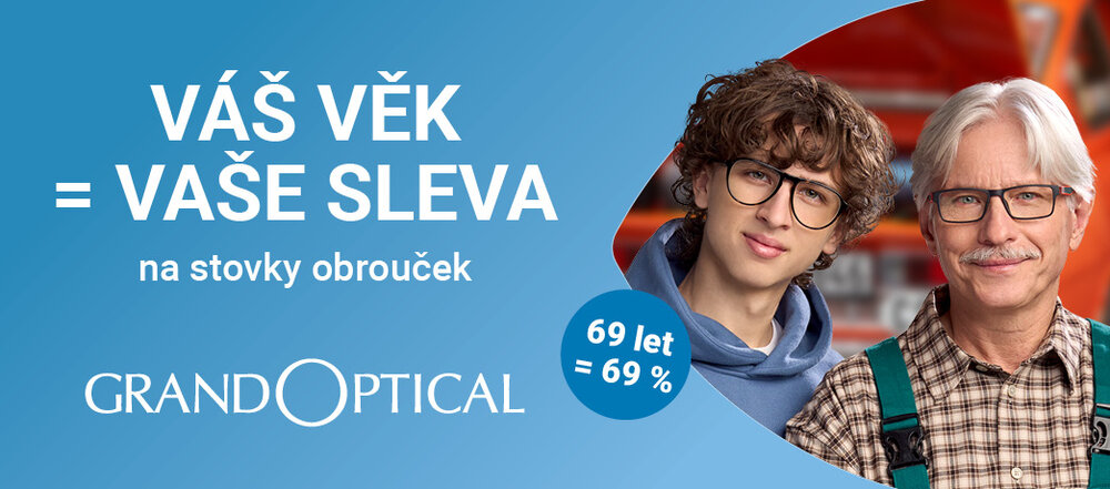 Sleva podle věku se vrací! Stavte se pro nové brýle a ušetřete na stylových obroučkách přesně tolik procent, kolik je Vám let. Sleva se vztahuje na vybrané obruby a platí při nákupu kompletních dioptrických brýlí (obruba + brýlové čočky). Více informací v prodejně GrandOptical nebo na www.grandoptical.cz.